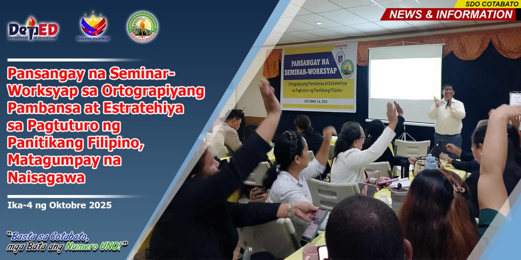- 𝐏𝐚𝐧𝐬𝐚𝐧𝐠𝐚𝐲 𝐧𝐚 𝐒𝐞𝐦𝐢𝐧𝐚𝐫-𝐖𝐨𝐫𝐤𝐬𝐲𝐚𝐩 𝐬𝐚 𝐎𝐫𝐭𝐨𝐠𝐫𝐚𝐩𝐢𝐲𝐚𝐧𝐠 𝐏𝐚𝐦𝐛𝐚𝐧𝐬𝐚 𝐚𝐭 𝐄𝐬𝐭𝐫𝐚𝐭𝐞𝐡𝐢𝐲𝐚 𝐬𝐚 𝐏𝐚𝐠𝐭𝐮𝐭𝐮𝐫𝐨 𝐧𝐠 𝐏𝐚𝐧𝐢𝐭𝐢𝐤𝐚𝐧𝐠 𝐅𝐢𝐥𝐢𝐩𝐢𝐧𝐨, 𝐌𝐚𝐭𝐚𝐠𝐮𝐦𝐩𝐚𝐲 𝐧𝐚 𝐍𝐚𝐢𝐬𝐚𝐠𝐚𝐰𝐚Isinagawa ang Pansangay na Seminar-Worksyap sa Ortograpiyang Pambansa at Estratehiya sa Pagtuturo ng Panitikang Filipino na dinaluhan ng mga guro continue reading : 𝐏𝐚𝐧𝐬𝐚𝐧𝐠𝐚𝐲 𝐧𝐚 𝐒𝐞𝐦𝐢𝐧𝐚𝐫-𝐖𝐨𝐫𝐤𝐬𝐲𝐚𝐩 𝐬𝐚 𝐎𝐫𝐭𝐨𝐠𝐫𝐚𝐩𝐢𝐲𝐚𝐧𝐠 𝐏𝐚𝐦𝐛𝐚𝐧𝐬𝐚 𝐚𝐭 𝐄𝐬𝐭𝐫𝐚𝐭𝐞𝐡𝐢𝐲𝐚 𝐬𝐚 𝐏𝐚𝐠𝐭𝐮𝐭𝐮𝐫𝐨 𝐧𝐠 𝐏𝐚𝐧𝐢𝐭𝐢𝐤𝐚𝐧𝐠 𝐅𝐢𝐥𝐢𝐩𝐢𝐧𝐨, 𝐌𝐚𝐭𝐚𝐠𝐮𝐦𝐩𝐚𝐲 𝐧𝐚 𝐍𝐚𝐢𝐬𝐚𝐠𝐚𝐰𝐚